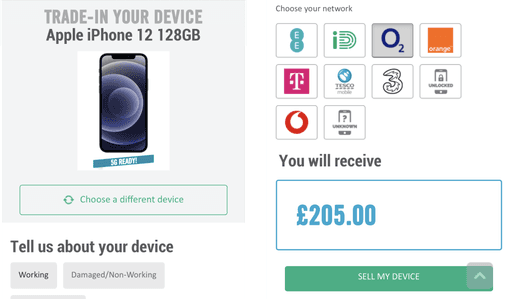 Call to action is clear and direct “Sell my device” helps to further the user journey
