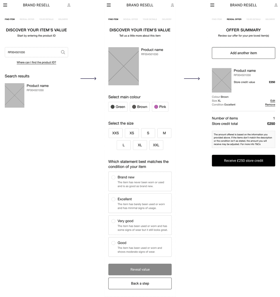 The next step was collating the research from the competitive analysis along with learnings from existing resell services offered (pain points, successes) – to define a list of requirements. I did this alongside the Product Manager, who created PRD documentation.
