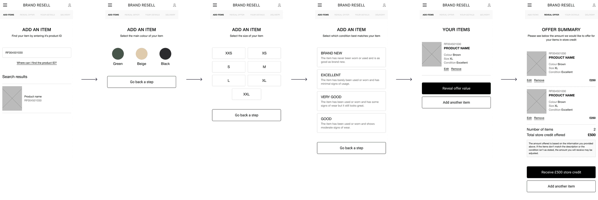 In Option A, the user would have to confirm all items they wanted to be resold before revealing the total offer. It was felt this could disengage users by showing the financial gains at too late of a stage.